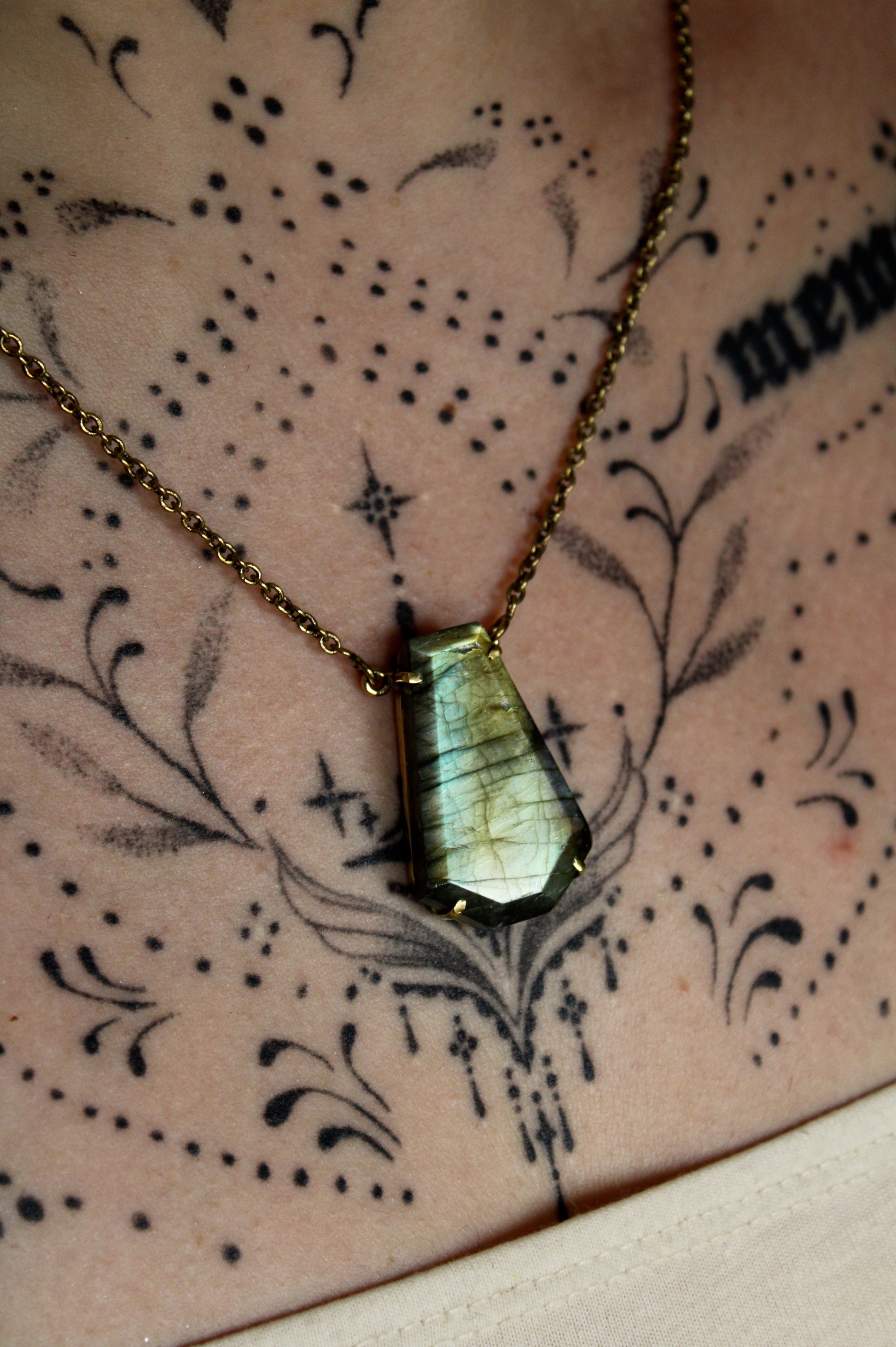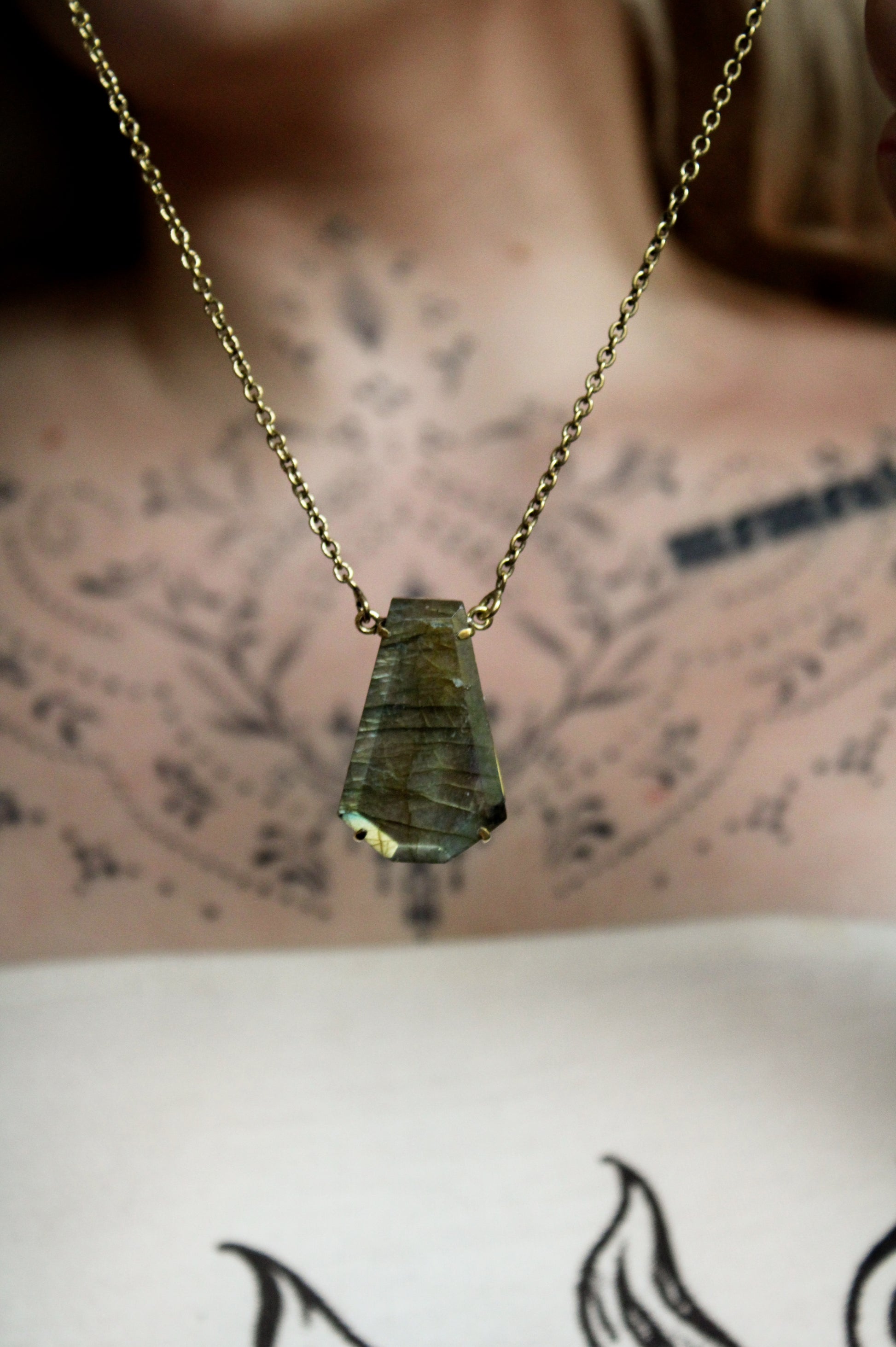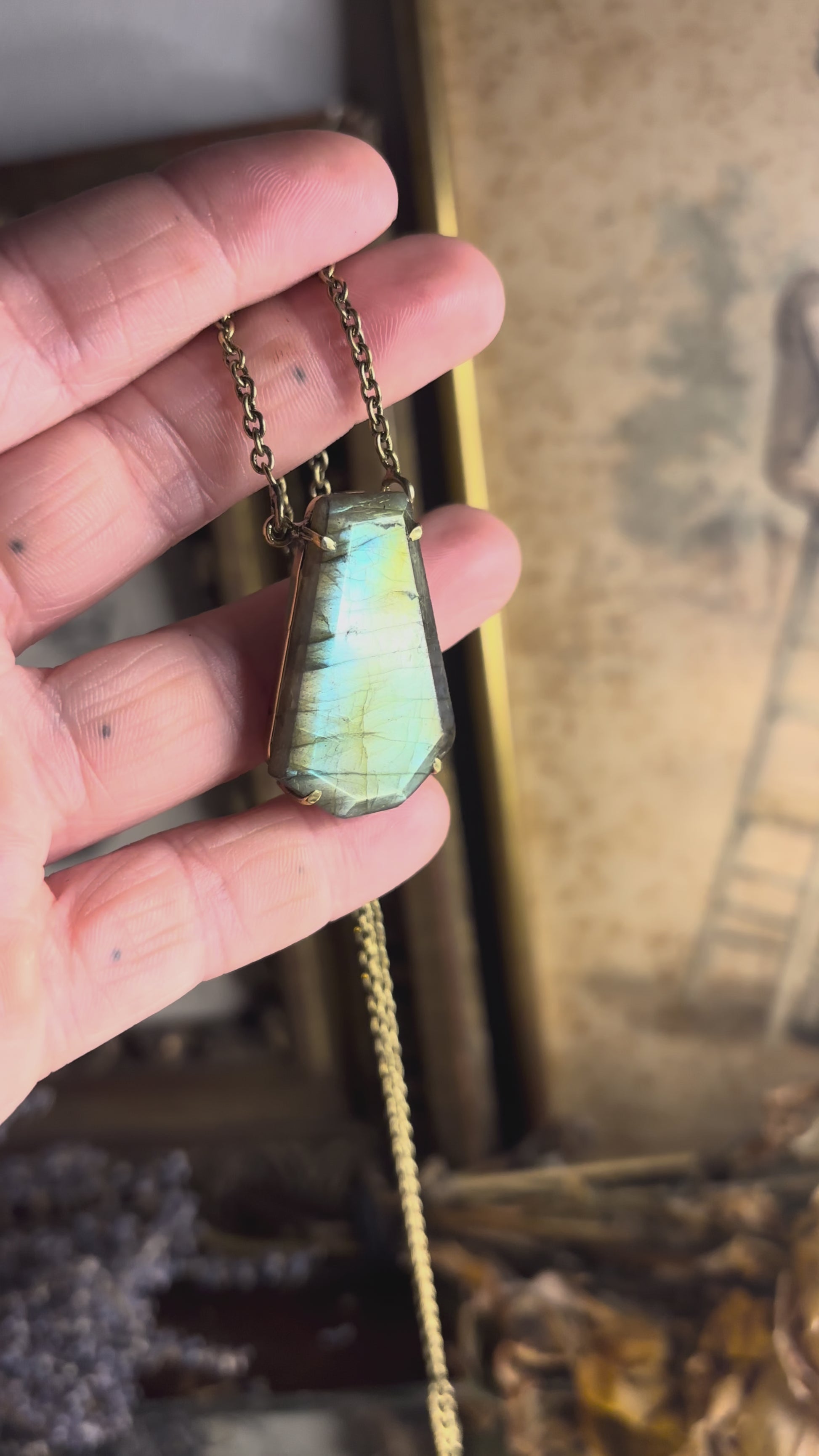 Un pendentif en labradorite aux reflets dorés, bleus et gris, monté sur une chaîne en laiton.