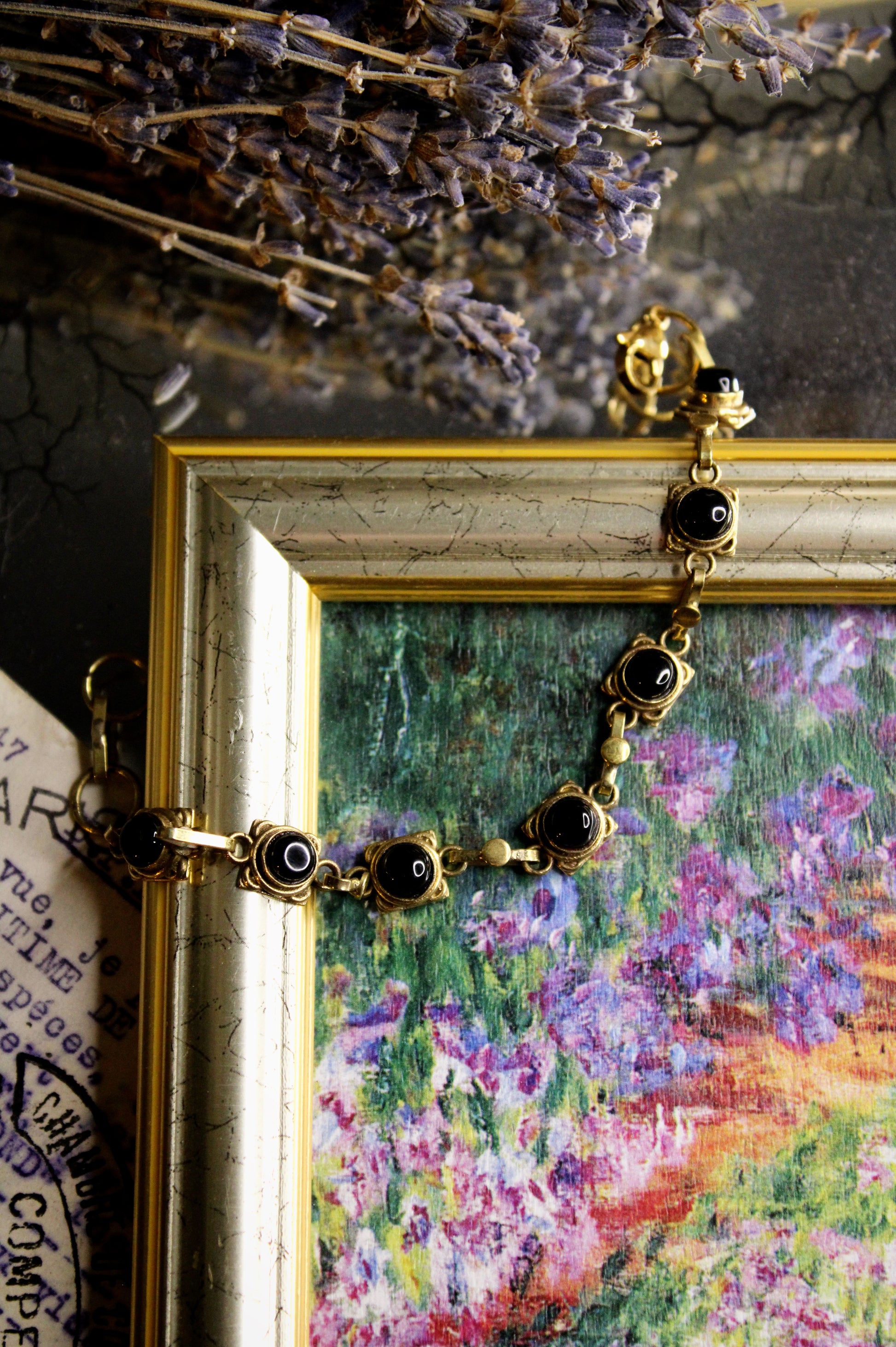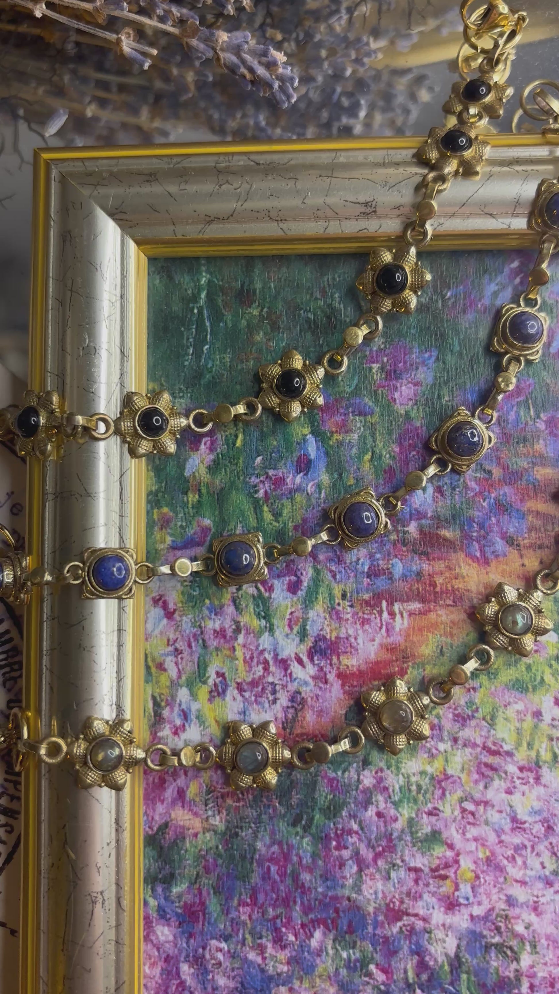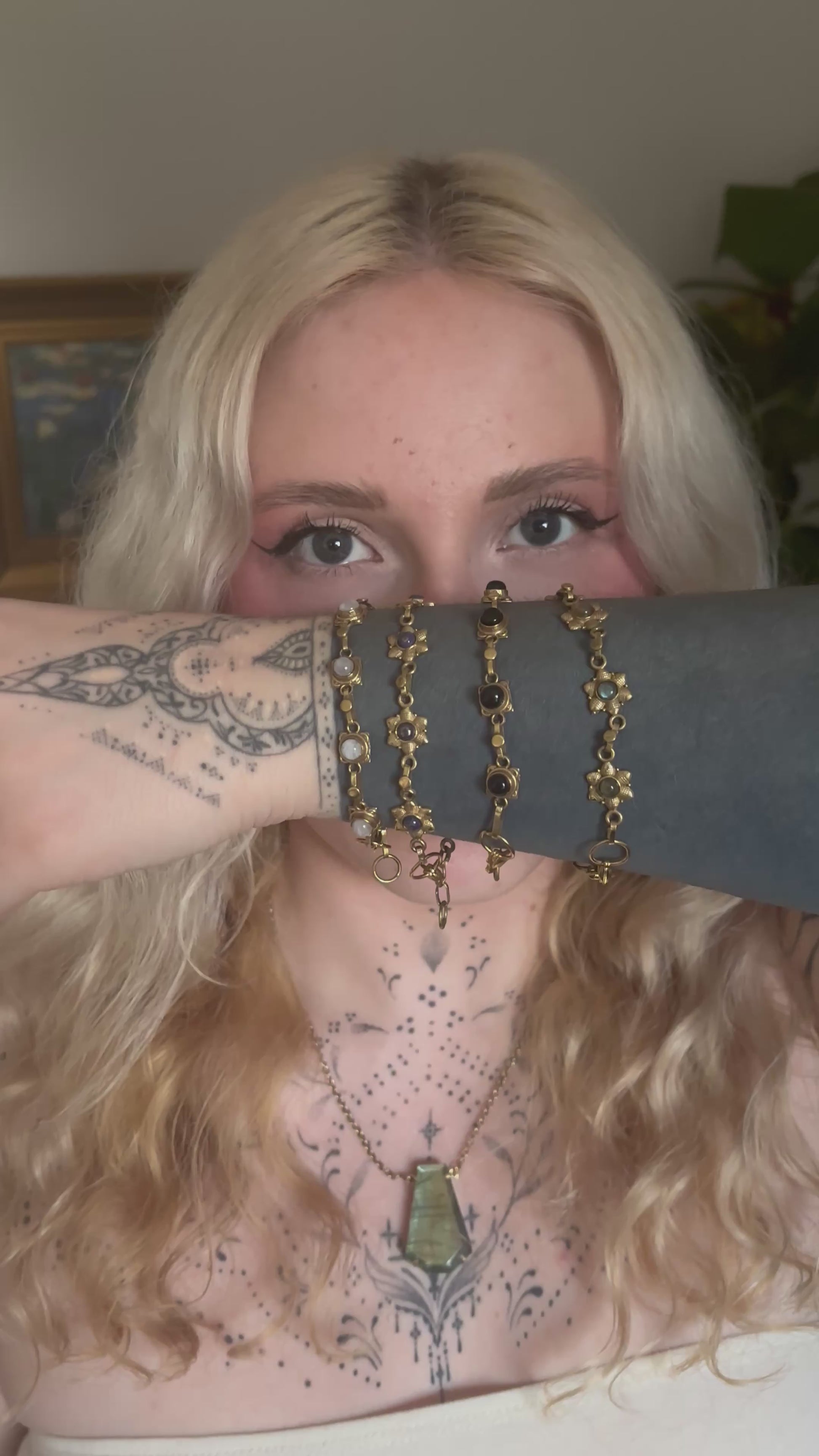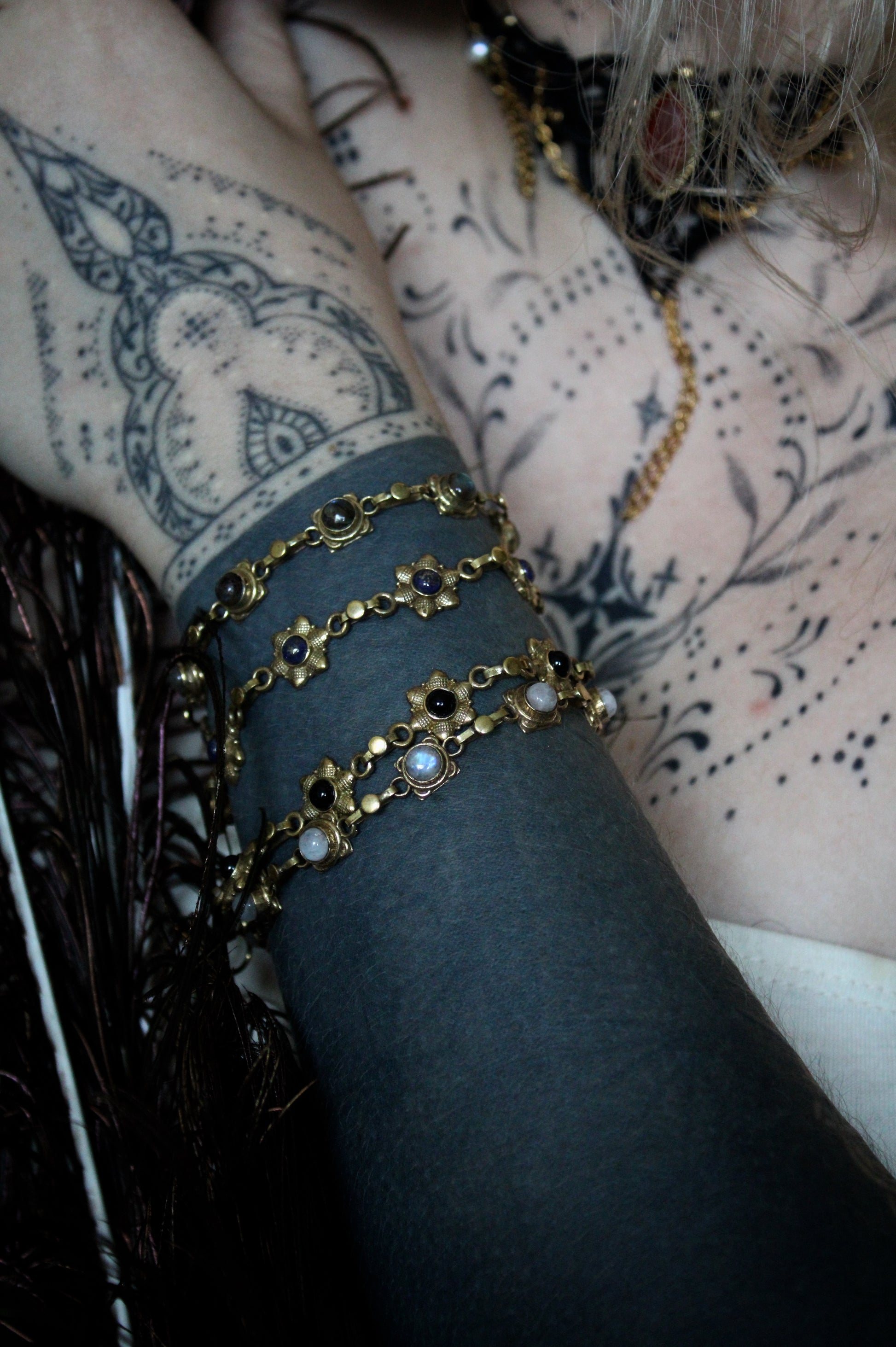 Sur chaque breloque composant le bijou se trouve une perle de pierre. Tous les maillons, anneaux et breloques sont en laiton. Seul le homard permettant de fermer le bracelet est en acier inoxydable. Ils peuvent s’adapter à votre morphologie grâce à cela.